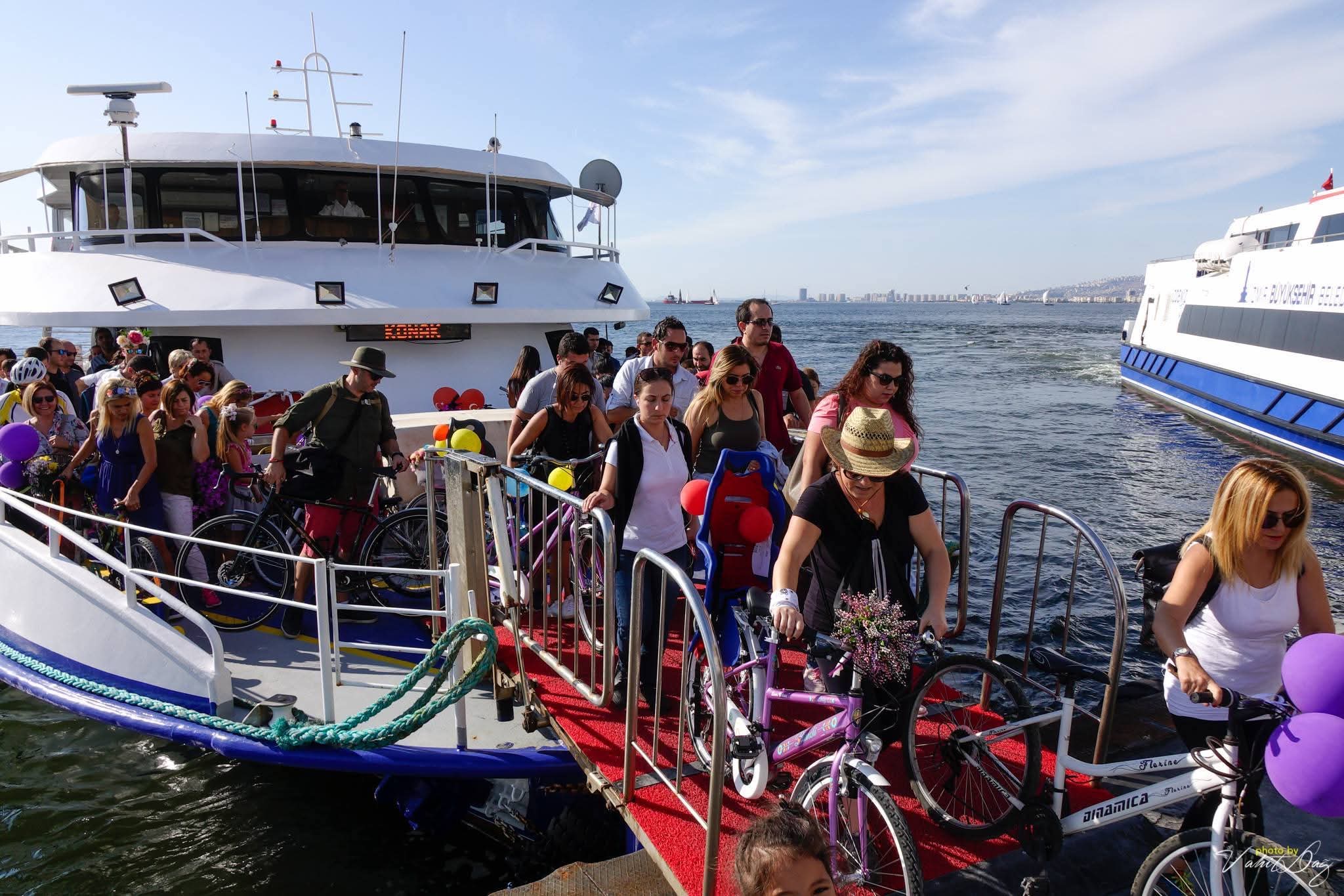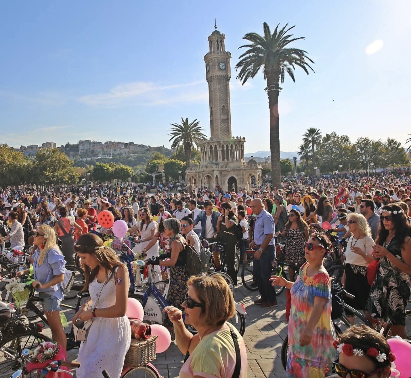 On the chosen Sunday afternoon, Sema and her friends gathered beneath the Konak clock tower, a well-known meeting point. They were expecting about ten or fifteen people to join in. But as they waited the slow trickle of women cycling into the square became a cascade of colour: flowers garlanding heads, hats and handlebars; colourful balloons matching vivid summer dresses; necklaces, pendants, even some stiletto-heeled shoes. Sunday runners, other cyclists and dog walkers along the waterfront, looked with interest at their eye-catching attire and elaborately adorned bikes. By the time they were ready to start, at least 200 women had filled the square.